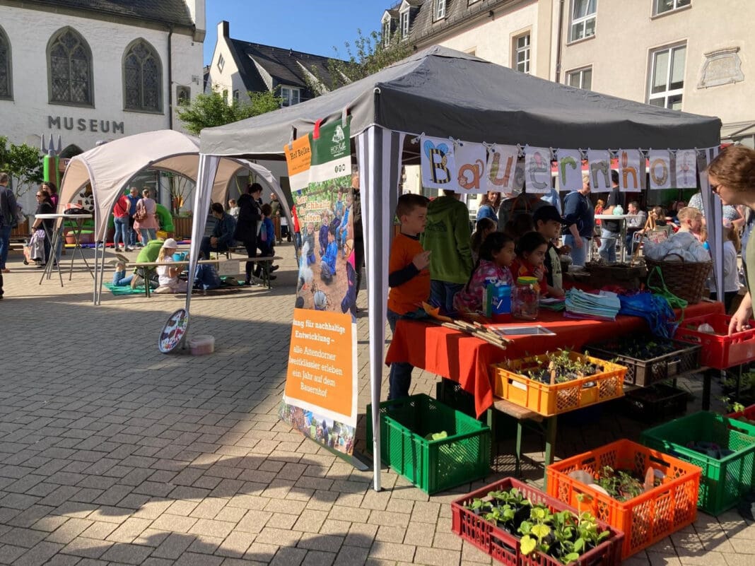 Der „Bauernhof-Express“ macht auf dem Alten Markt halt. Damit stellt der Hof Belke zusammen mit Zweitklässlerinnen und Zweitklässlern der Grundschulen aus Attendorn, Helden, Ennest und Heggen Projekte aus der „Zukunftswerkstatt für Weltverbesserer“ vor. So werden zum Beispiel Jungpflanzen für den Garten, selbstgemachte Nudeln und Kerzen sowie vieles weitere Gebastelte und Gebaute aus den Weltverbesserungsprojekten der Kinder verkauft. Leckeres Fruchteis darf verköstigt werden und Workshops zum Filzen werden angeboten.