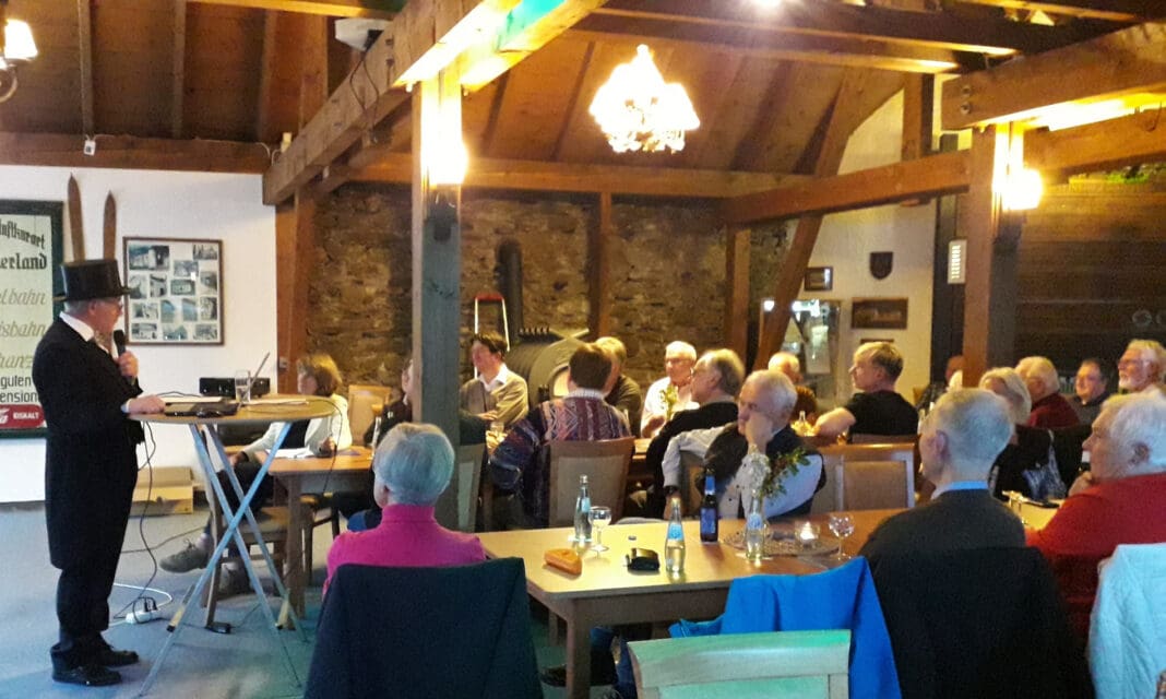 Zunächst präsentierte Uli Rauchheld kenntnisreich und humorvoll die spannende Entwicklung von Dorf und Freiheit Bilstein. Er kombinierte die Herrschafts- und Siedlungsgeschichte mit dem Alltag der Dorfbewohner, gab dazu Einblicke in die Wirtschafts- und Vereinsgeschichte und – Bilsteiner Besonderheit – den Tourismus, dies alles verbunden mit zahlreichen biografischen Informationen. Eine Vielzahl historischer Fotos illustrierte den abwechslungsreichen Gang durch die Geschichte und animierte wohl manchen Zuhörer, eine ähnlich lebendige Präsentation für den eigenen Heimatort zu versuchen.