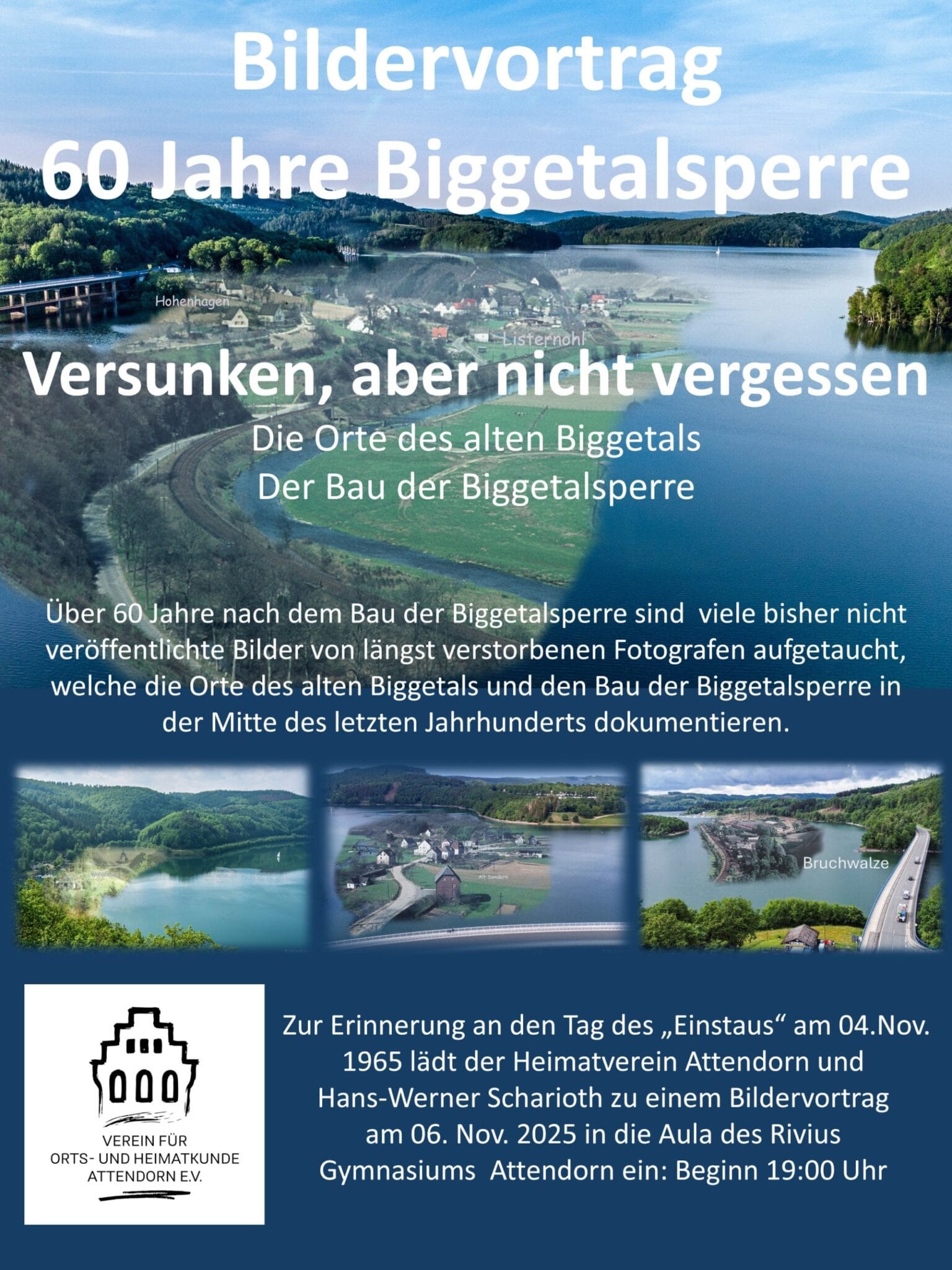 Zur Erinnerung an den Tag des „Einstaus“ am 04. November 1965 lädt der Heimatverein Attendorn und Hans-Werner Scharioth zu einem Bildervortrag am 06. November 2025 um 19 Uhr in die Aula des Rivius Gymnasiums Attendorn ein.