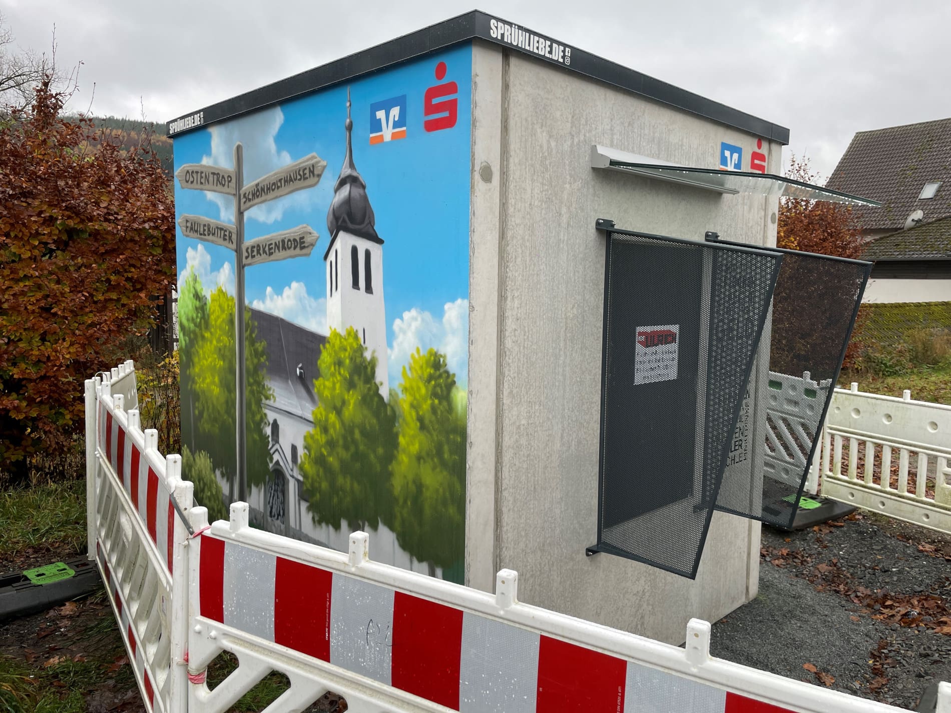 Der sprengsichere Geldautomaten-Cube in Fretter: kreativ gestaltet mit heimisch Motiven wie der Knochenmühle, der Kirche und einem Wegweiser zu benachbarten Orten – ein sicherer und zugleich regional geprägter Blickfang im Ortsbild (Foto: Volksbank Sauerland)