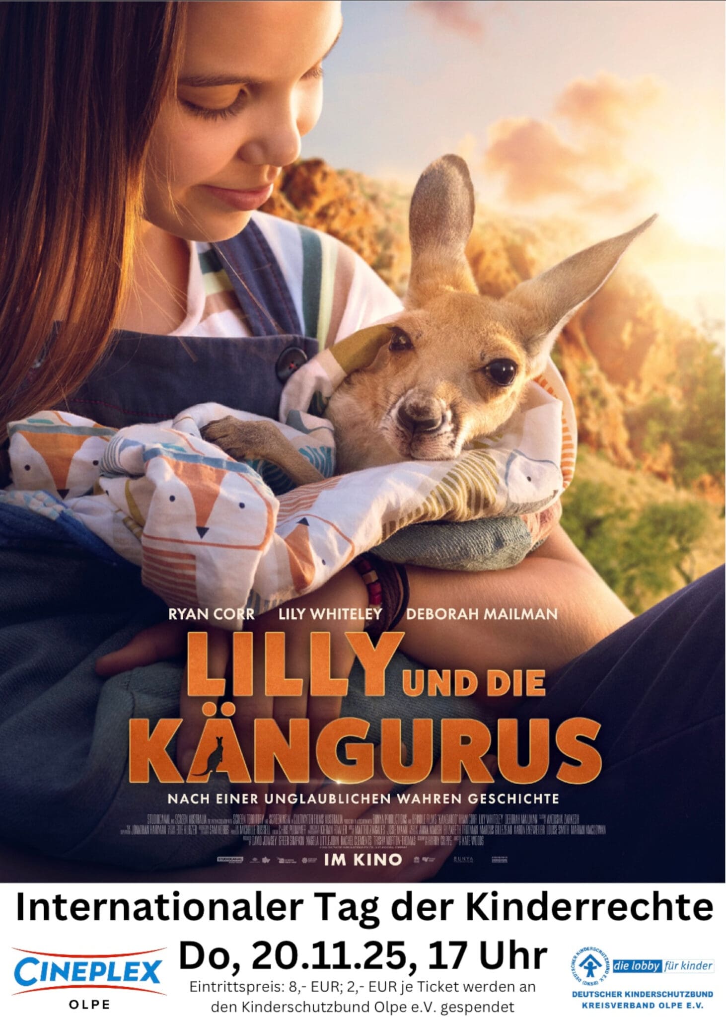 „Zum Internationalen Tag der Kinderrechte am 20.11.“ zeigt der Deutsche Kinderschutzbund Kreisverband Olpe e.V. in Kooperation mit dem Cineplex Olpe, am Donnerstag, 20.11.2025, um 17.00 Uhr, den Film „Lilly und die Kängurus“ (FSK 6).