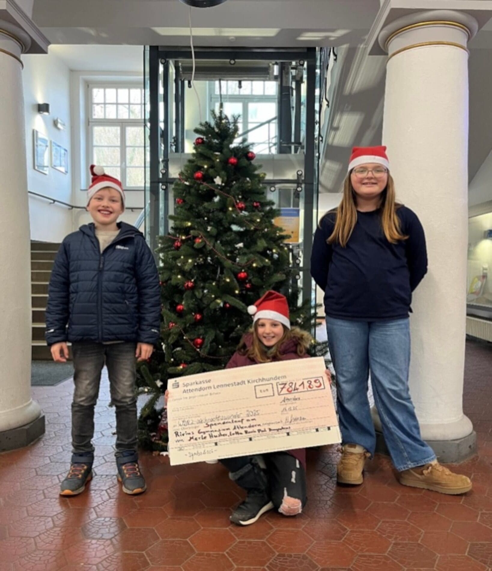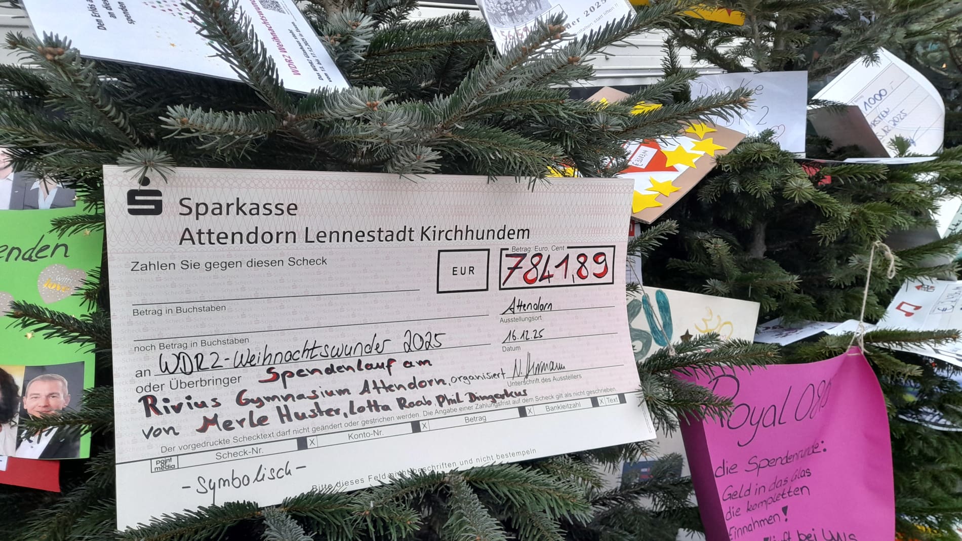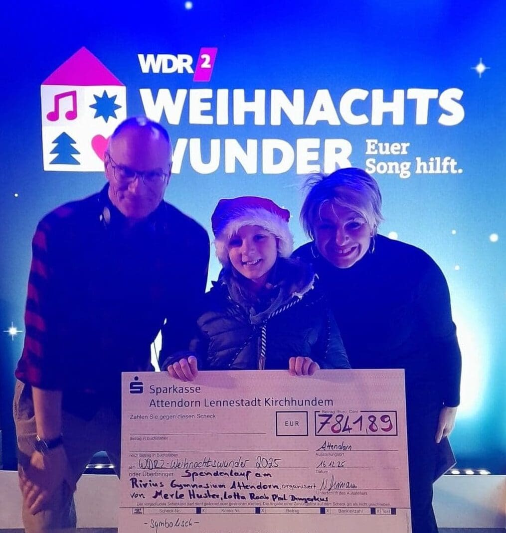 Der Höhepunkt des Projekts fand nun am 17.12.2025 in Essen statt. Hier übergab Merle Huster stellvertretend für ihre Jahrgangsstufe den Spendenscheck beim WDR 2 Weihnachtswunder. Merle erklärte: „Jeder Schüler aus der sechsten Klasse hat sich Sponsoren gesucht und die Sponsoren durften sich den Betrag, den sie für jede Laufrunde spenden wollen, selbst aussuchen.“
