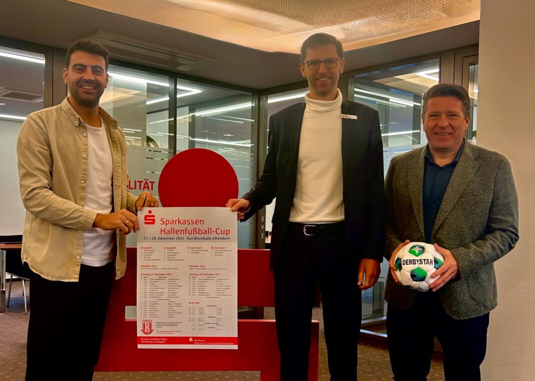 Mit großer Vorfreude präsentiert der Veranstalter Stadtsportverbandvorsitzende Jens Selter, der Ausrichter SV Türk Attendorn sowie der Sponsor die Sparkasse Attendorn-Lennestadt-Kirchhundem das Plakat zum Tunier und freuen sich auf ein gut besuchtes Turnier.