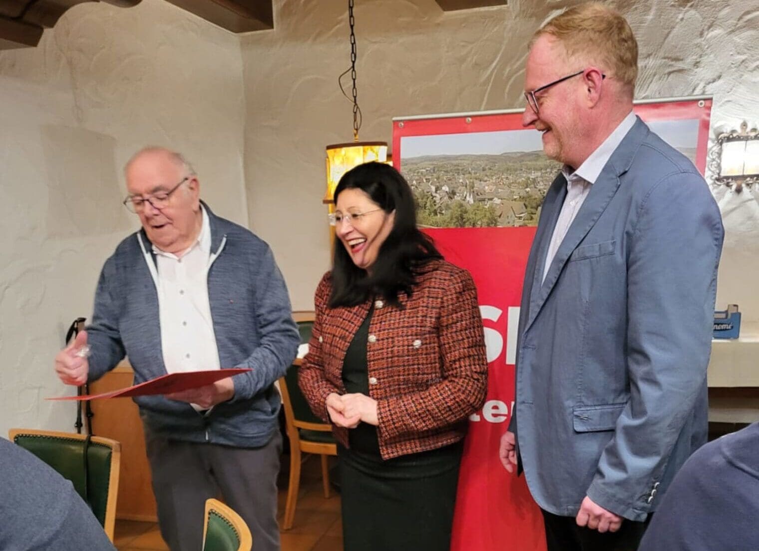 Im Himmelreich sorgte der Ortsvereins Vorsitzende Michael Hoberg, unterstützt vom Fraktionsvorsitzenden Uli Bock, für viele Lacher und eine besonders persönliche Note als den anwesenden Jubilarinnen, Jubilaren und Geburtstagskinder die Glückwünsche für ihr jahrzehntelanges Engagement und Mitgliedschaft entgegengebracht wurden.