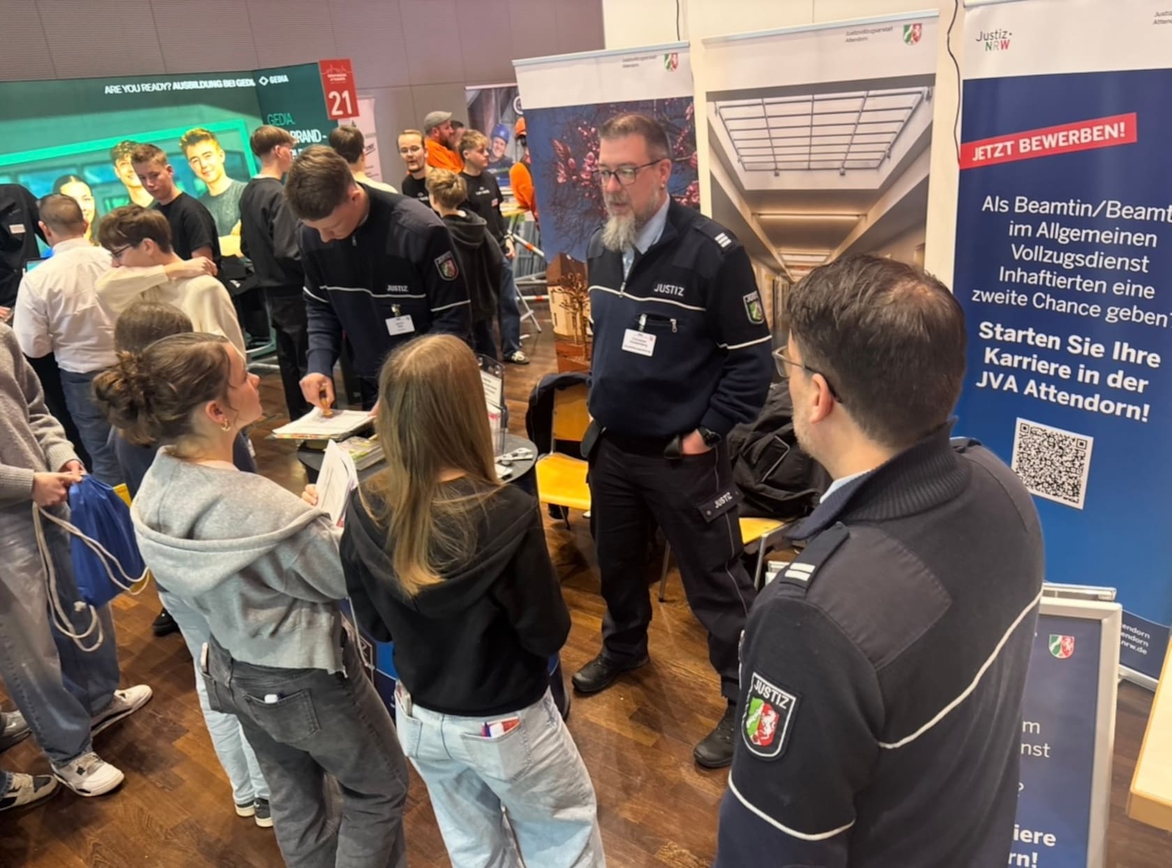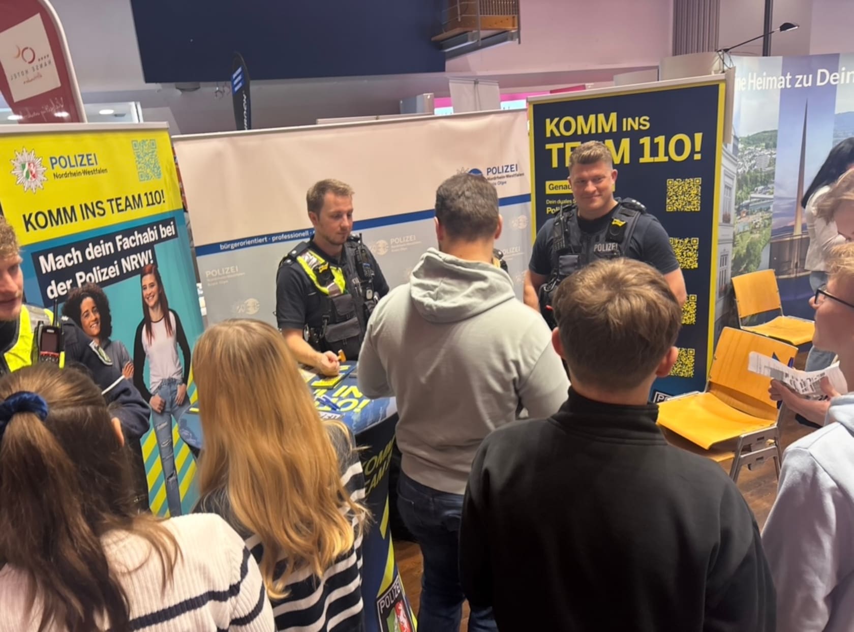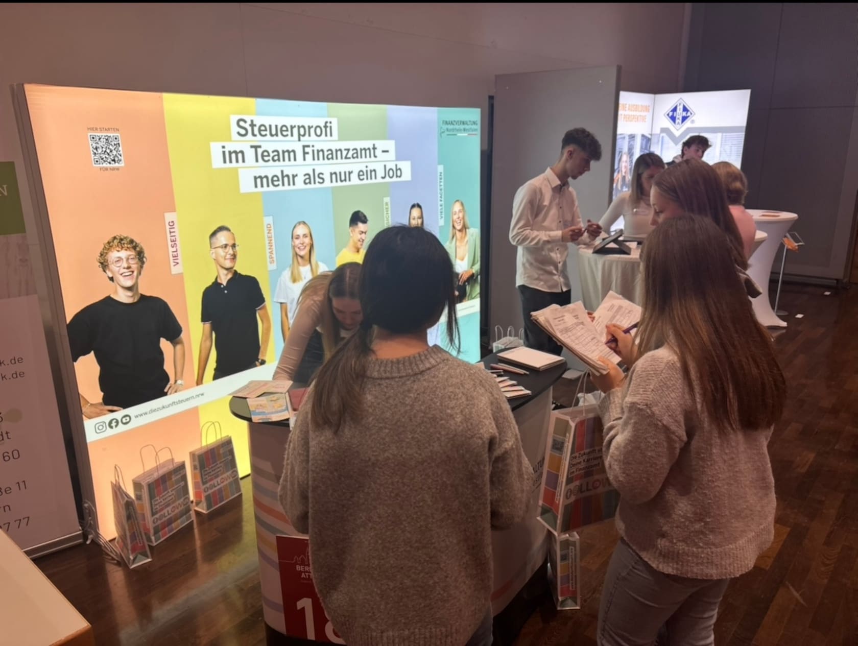 Nach einer wohlverdienten Mittagspause öffnete die Messe ihre Türen für die Öffentlichkeit. Auch am Nachmittag war die Stadthalle sehr gut besucht: Zahlreiche Jugendliche kamen gemeinsam mit Freunden oder ihren Erziehungsberechtigten, um sich über die vielfältigen beruflichen Möglichkeiten nach der Klasse 10 oder dem Abitur zu informieren.