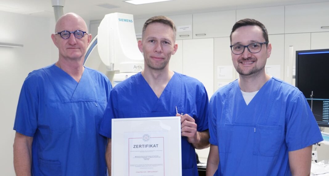 Die Chest-Pain-Unit ist auf die rasche und leitliniengerechte Abklärung und Behandlung von Patientinnen und Patienten mit akuten Brustschmerzen spezialisiert. Ziel ist es, insbesondere lebensbedrohliche Erkrankungen wie den Herzinfarkt schnell und sicher zu diagnostizieren oder auszuschließen. Die erneute Zertifizierung bestätigt, dass Struktur-, Prozess- und Qualitätsanforderungen der Fachgesellschaft in vollem Umfang erfüllt werden.